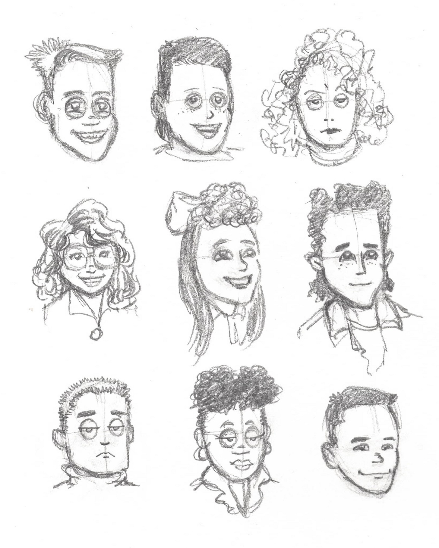 I’ve always had a hard time drawing kids. And, for Eerie’s pitch packet (y’see what I mean, there’s a theme that’s developing) I needed to draw some character sketches of some of her schoolmates. So, for practice I cracked open my old elementary school yearbook to see what we looked like back in the early 90’s. Let me tell you, we were goofy lookin’ back in the day, and the hair was so big. Here’s some cartoonized faces of kids that were in my sixth grade class.